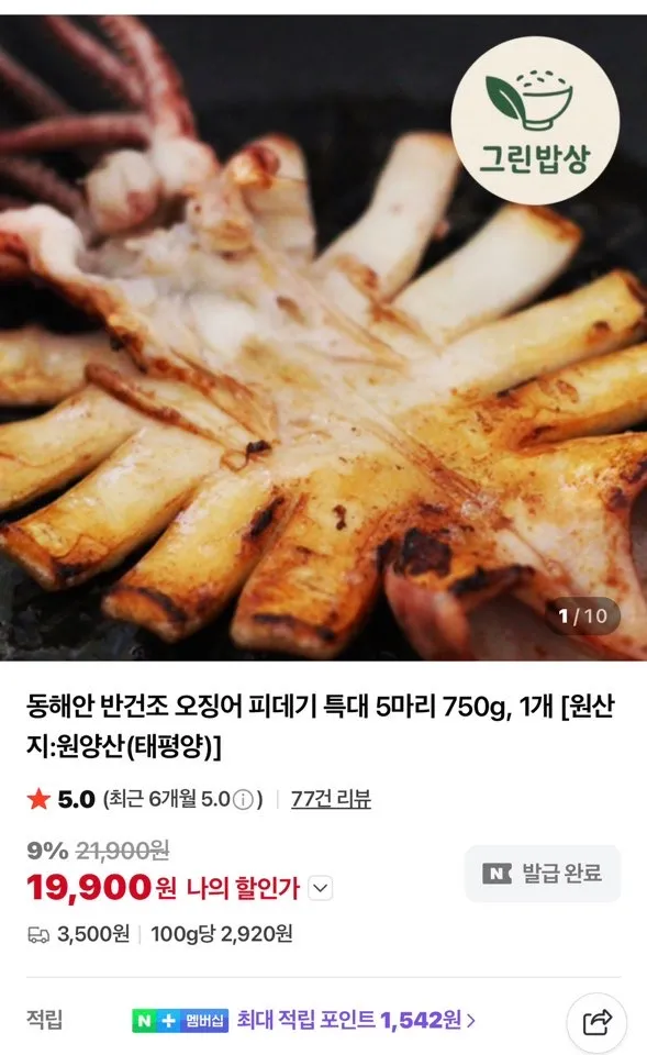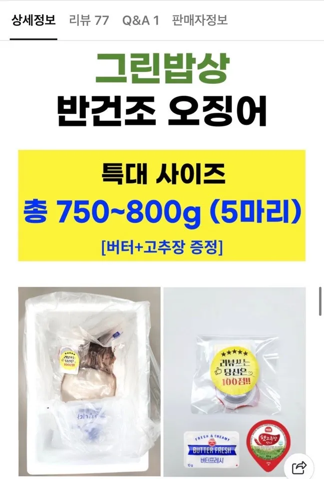 다나와동해안 영덕 반건조오징어 맥반석 피데기 5마리추정 26,700원5마리 제품, 100g당 3,543원 기준 750g 추정가