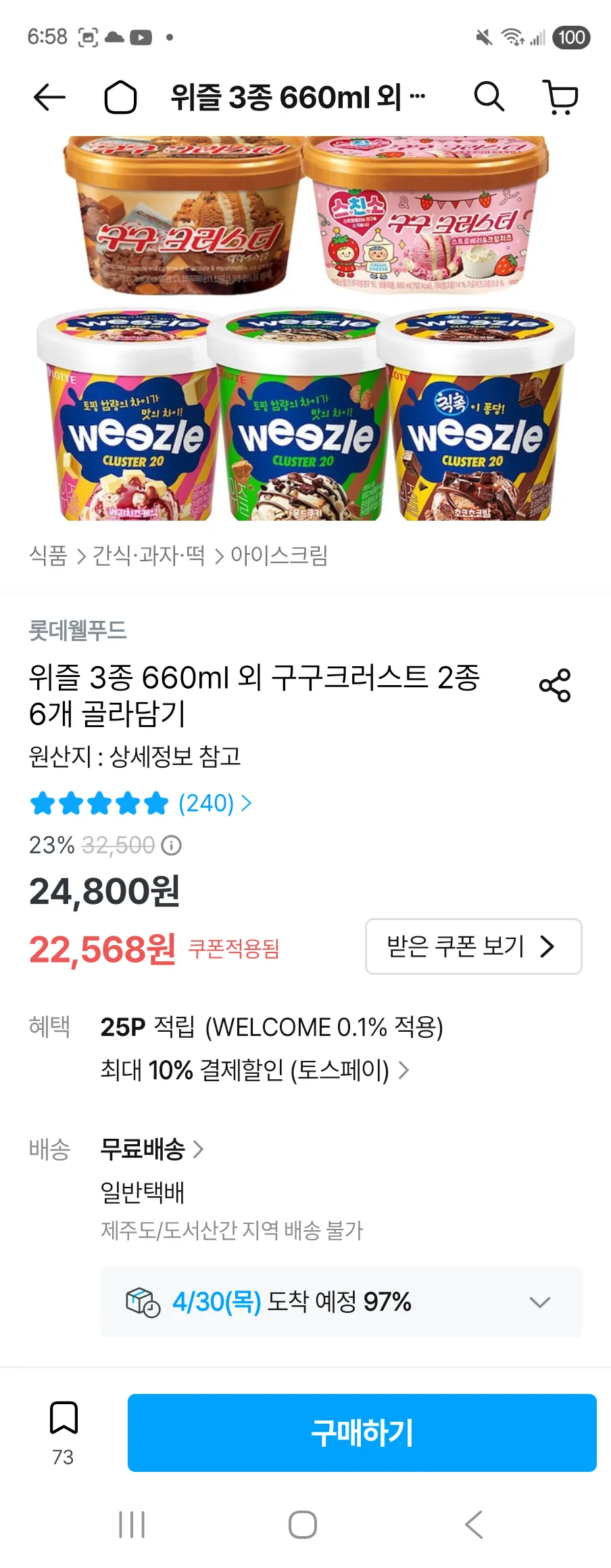 | 롯데ON | [롯데웰푸드]떠먹는 아이스크림 5종 6개 골라담기 구구크러스터 찰떡아이스홈 위즐 등 | 26,490원 | 최종가 무료배송, 위즐 포함 가능 |