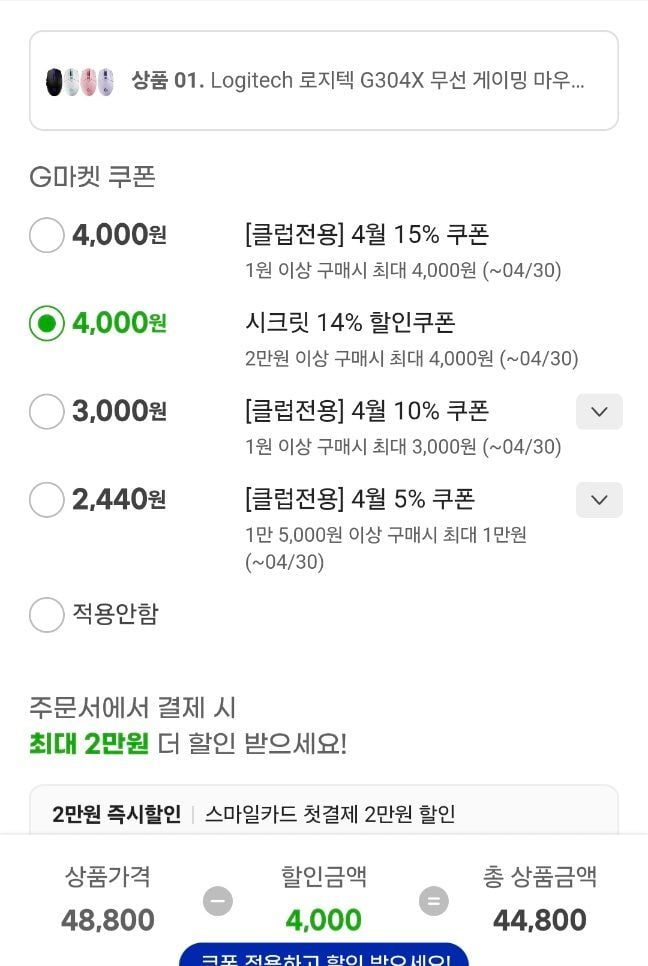 유클없어도 시크릿 14%? 이거 뭐 이상한거 붙는데 이거쓰면 44800원 똑같이나옴 이거도 없으면 그냥 4.8임
