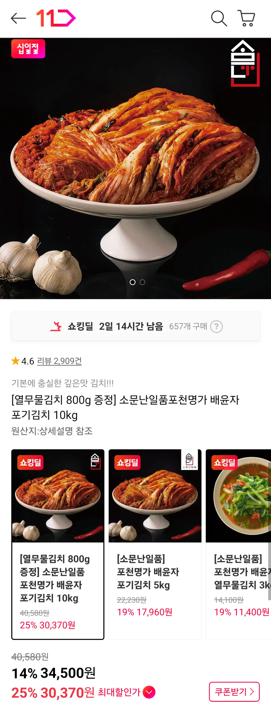 국내산 포기김치 10키로+열무물김치 800g 32,500원 싼듯