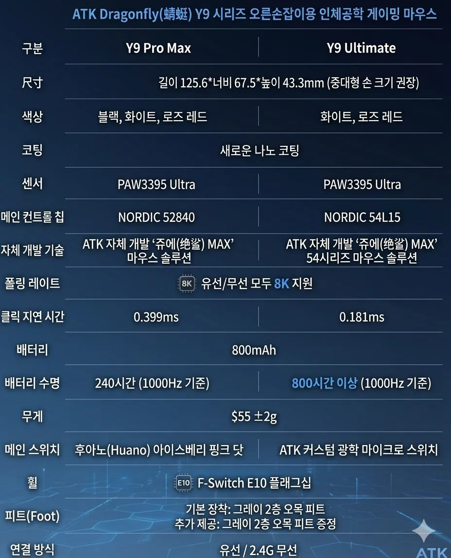 옥션ATK 잠자리 Y9 무선 게이밍 마우스 Y9 Ultimate PAW3950Ultra 8k83,000원GEM수신기포함, 0.181ms, 800mAh
