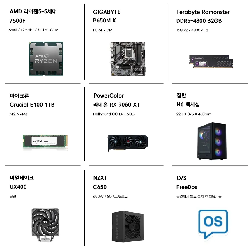 | 이마트 | AMD 7500F+RX9060XT 16GB+32GB+1TB 조립PC 게이밍컴퓨터 | 1,245,480원 | 가장 저렴한 가격 발견 |