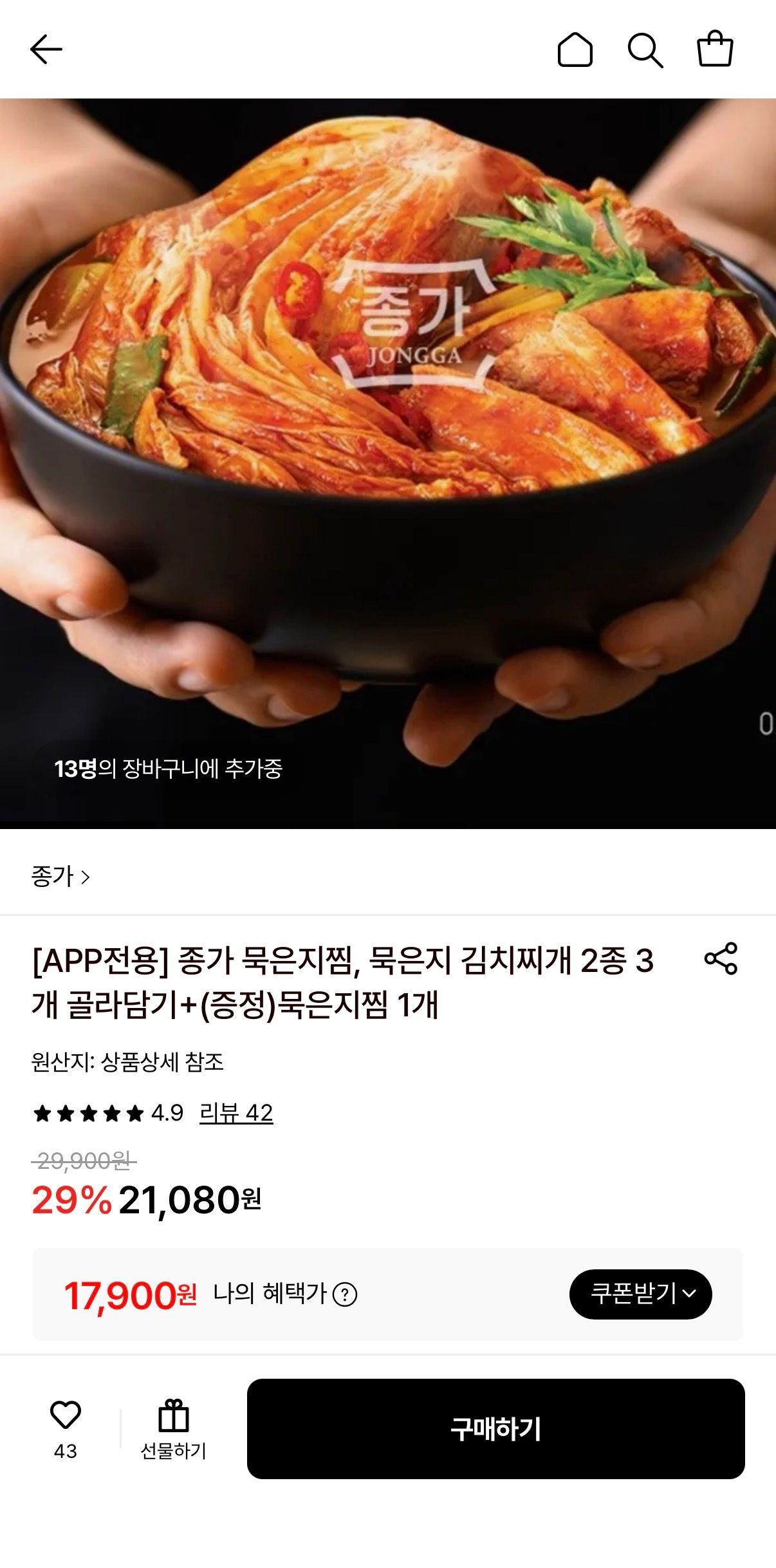 📦 종가 묵은지찜, 묵은지 찌개 2종 3개 골라담기+묵은지찜 1개 증정
