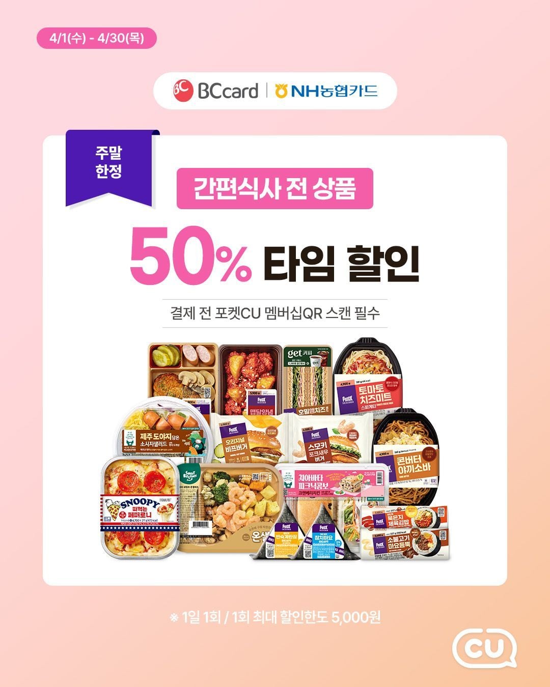 | CU | (주말/공휴일 한정) 간편식사 전 상품 50% 할인 | 5,000원 | 핫딜모음에서 제공한 가격 |