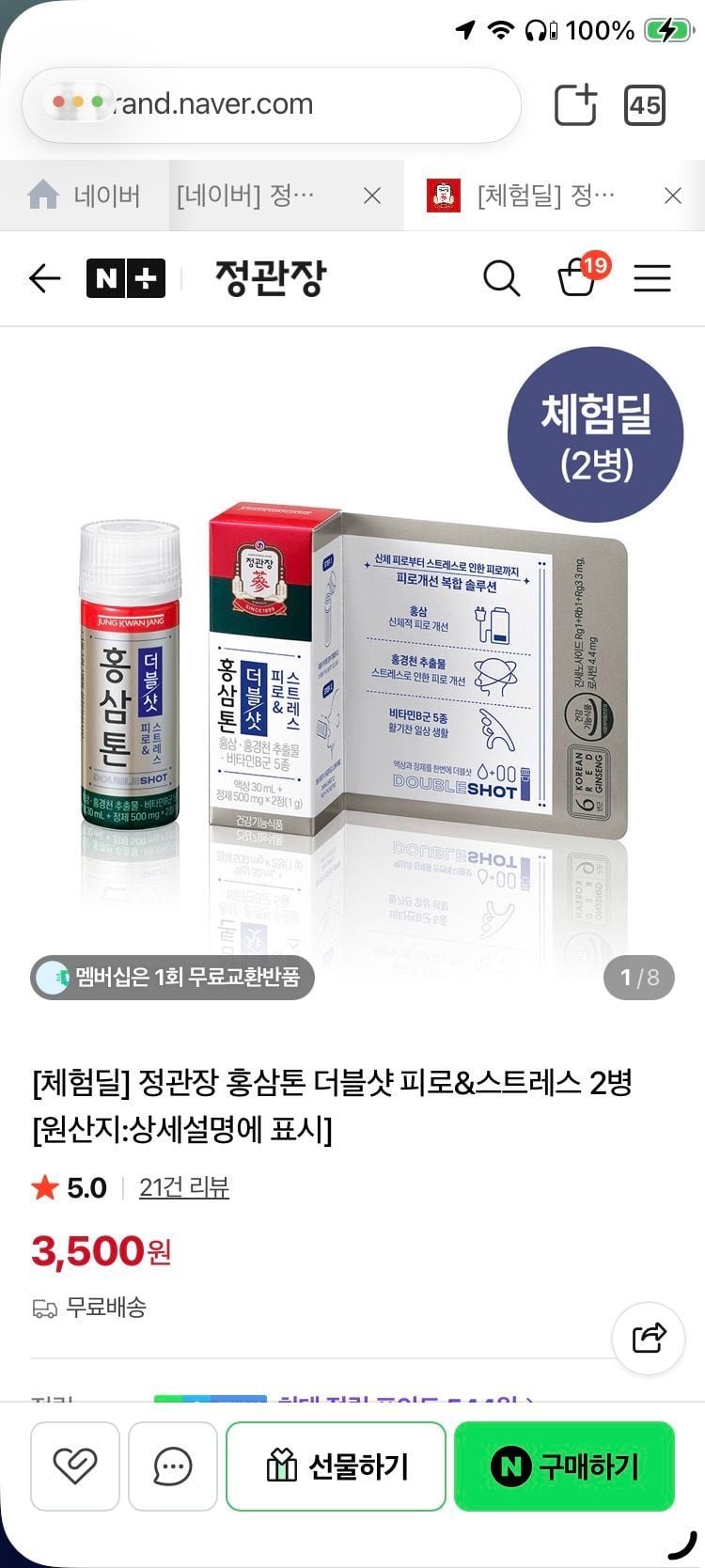 📦 [체험딜] 정관장 홍삼톤 더블샷 피로&스트레스 2병