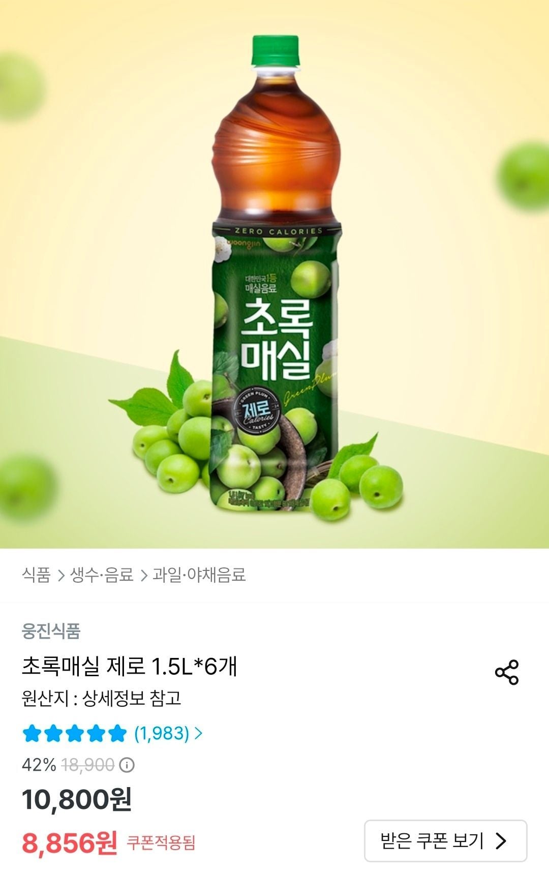 쿠팡웅진식품 초록매실 1.5L (6개)12,290원가격비교 정보