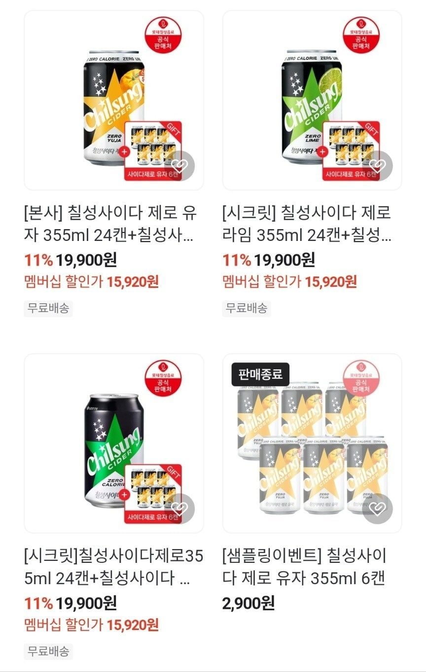 | 롯데ON | 롯데칠성 칠성사이다 제로 355ML (24개) | 14,780원 | 제로 유자 미포함 |