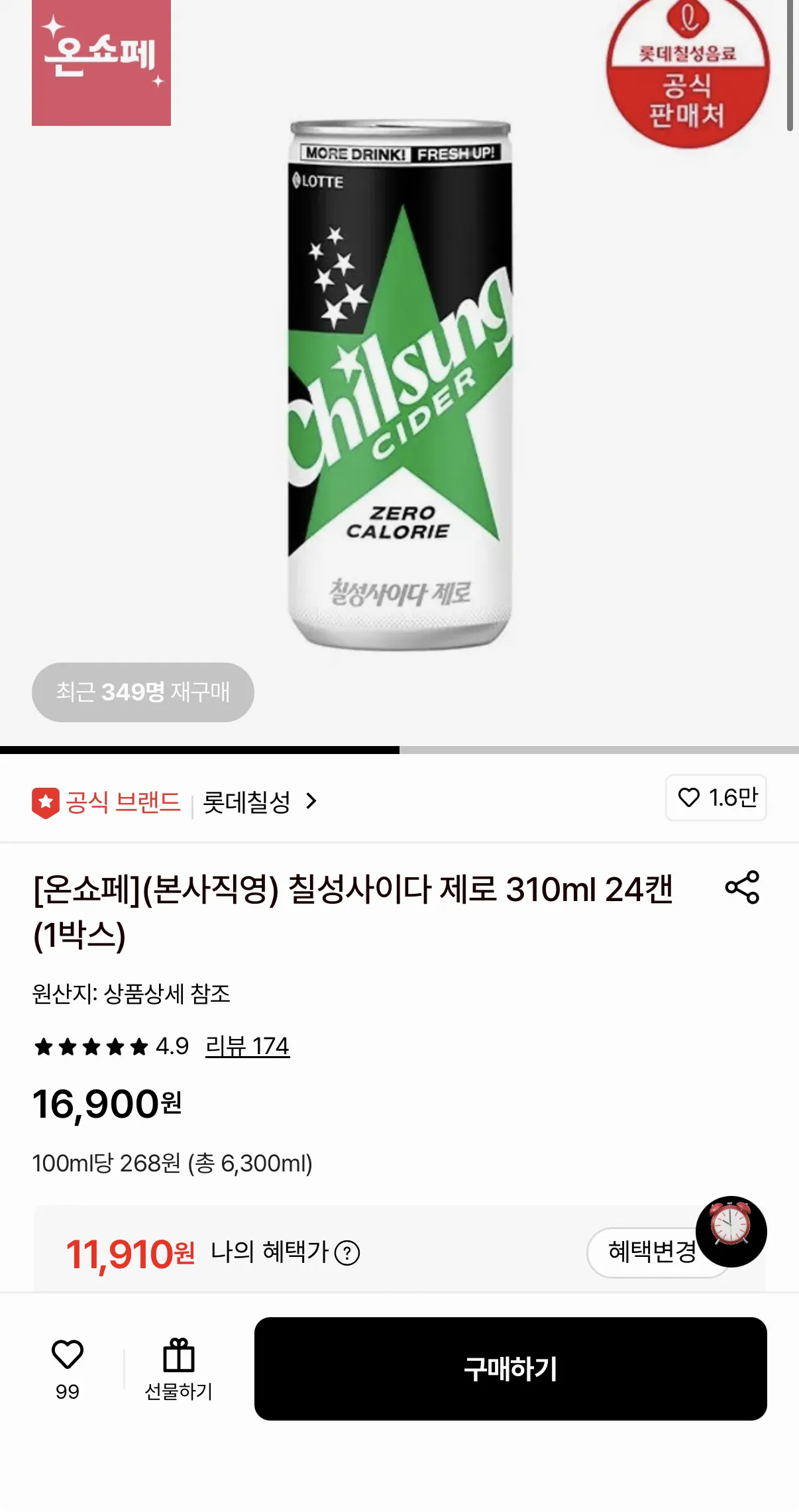 롯데온칠성사이다 제로 310ml 24캔11,910원핫딜모음핫딜모음에서 제공한 가격