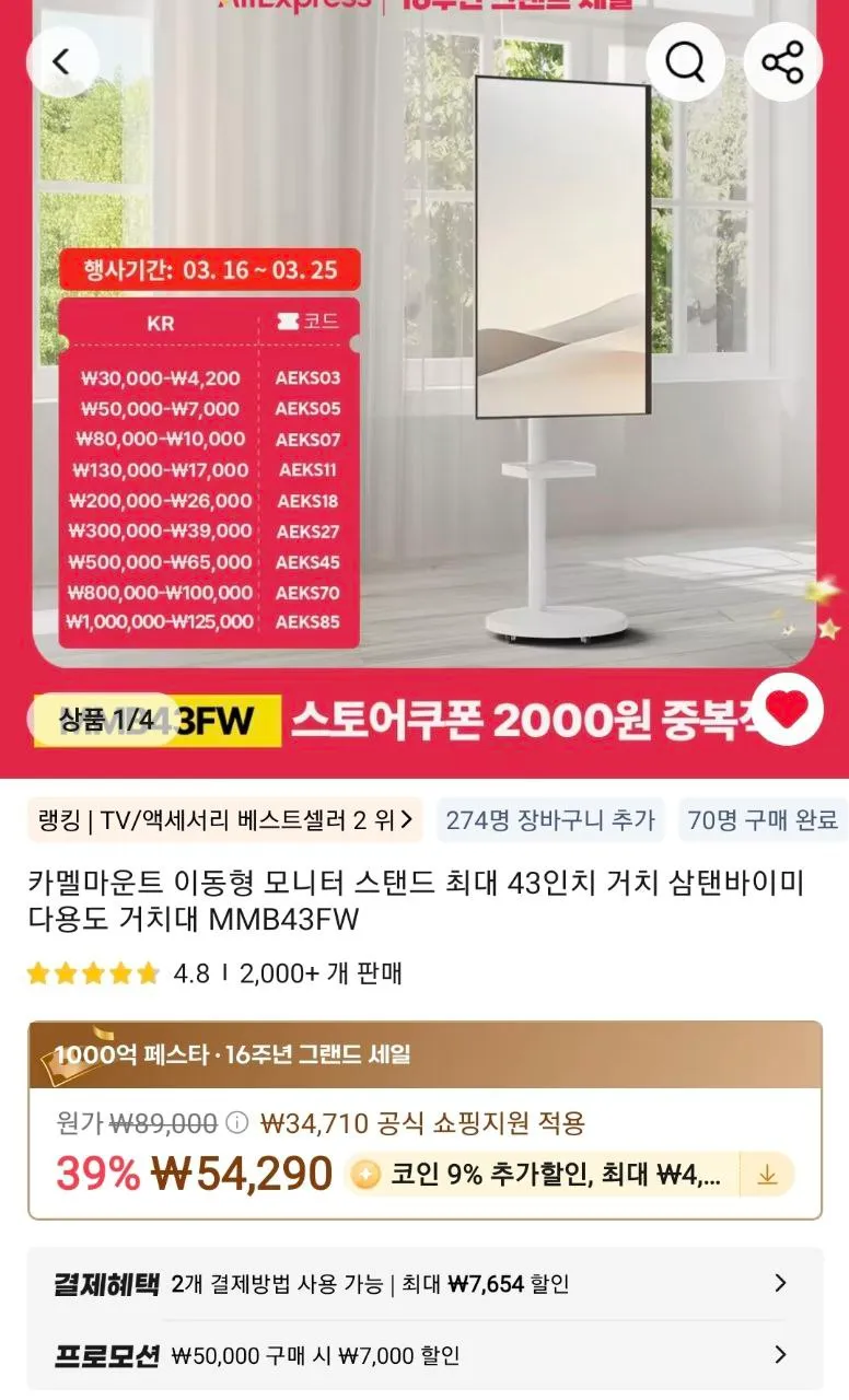 | 알리 | 카멜마운트 이동형 TV 거치대 MMB43FW | 40,404원 | 핫딜모음에서 제공한 가격 |