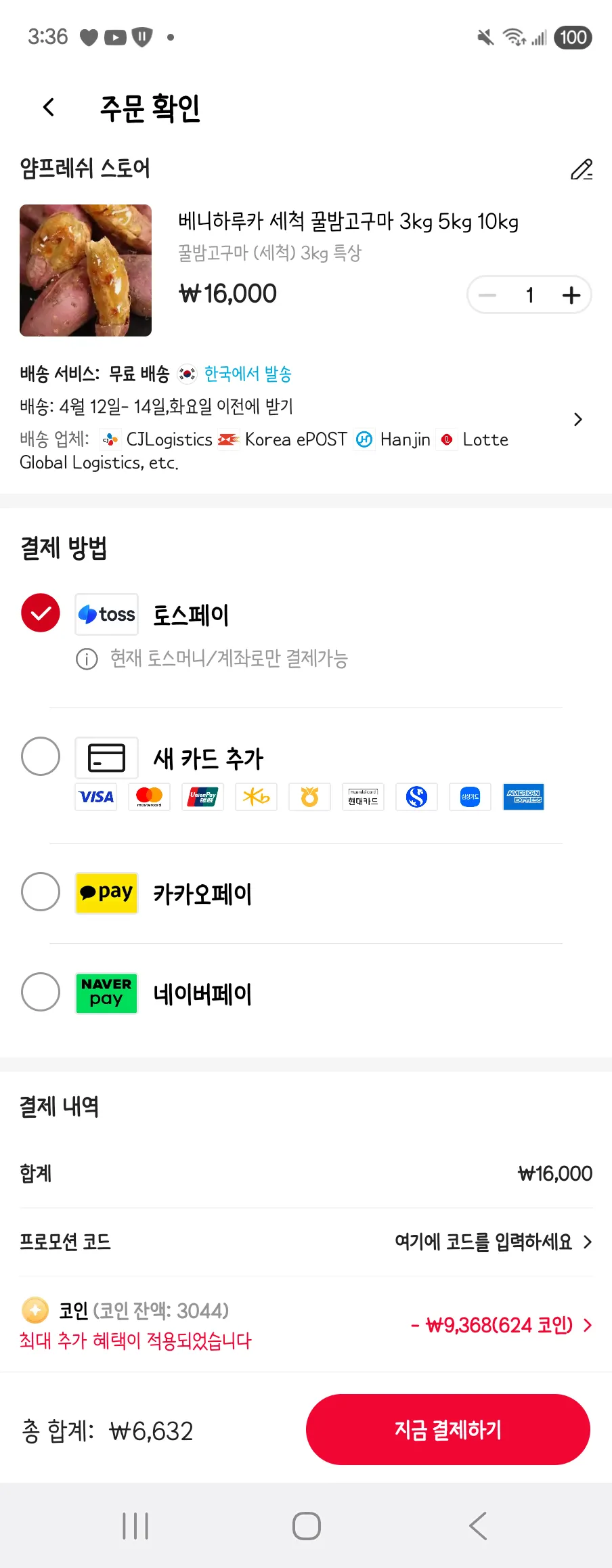 📦 (코인딜) 꿀밤고구마 특상 3kg