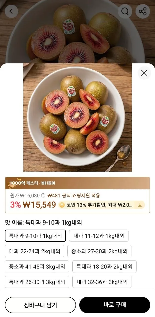 알리(코인딜)제스프리 루비 골드 키위 특대과 9-10과 1kg*2세트17,768원핫딜모음핫딜모음에서 제공한 가격