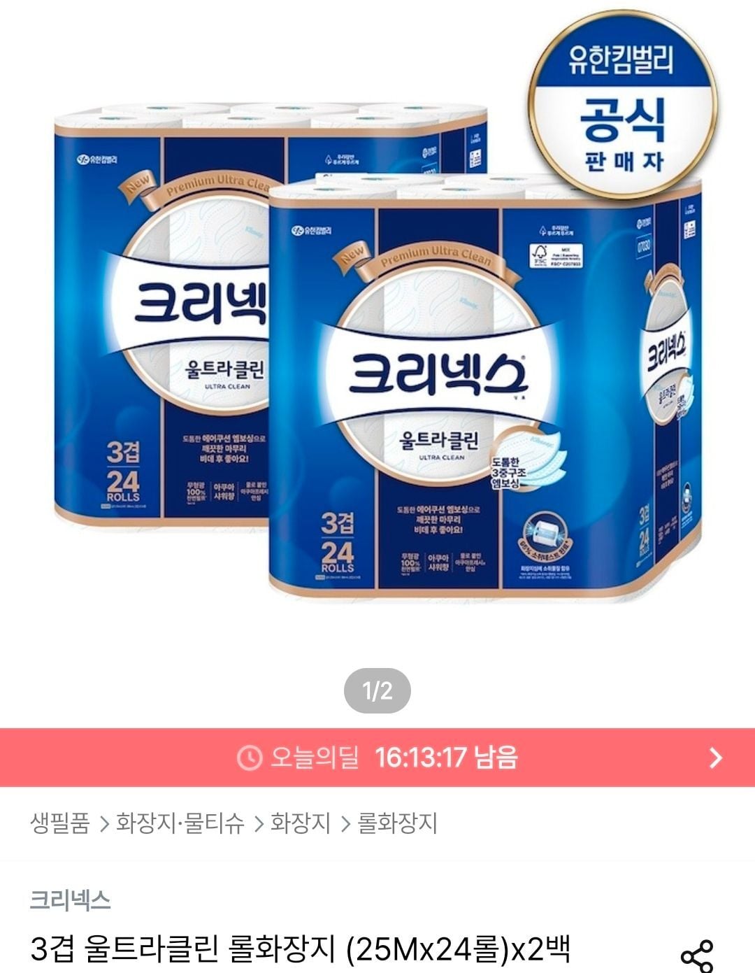 📦 크리넥스 3겹 울트라클린 25M 24롤 2팩