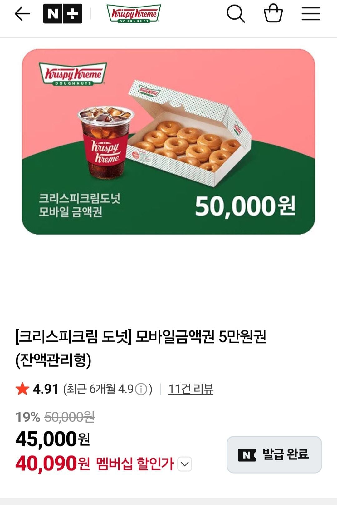 📦 [크리스피크림 도넛] 모바일금액권 5만원권(잔액관리형) 네멤