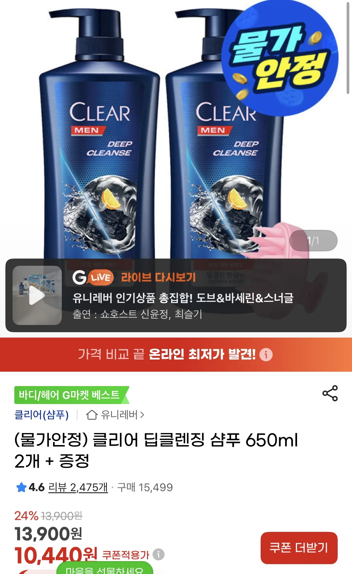 유니레버 클리어 딥클린 맨 샴푸 650ml (1개 기준)