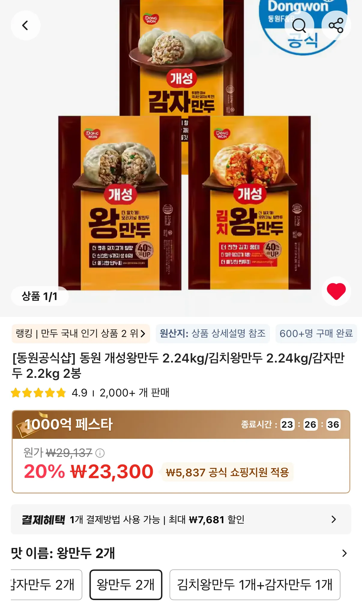 | 석s스토어 | 동원 개성왕만두 2.24kg/김치왕만두 2.24kg/감자만두 2.2kg 2봉 | 24,409원 | 동일 상품, dasaja 언급 |