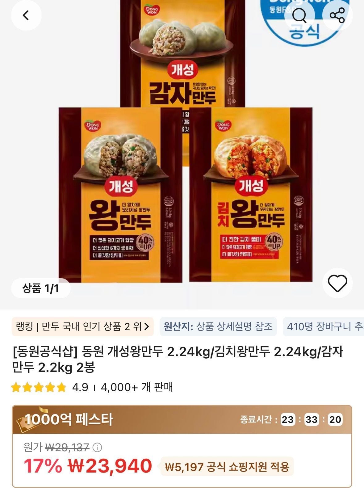 | 알리 | 타임딜 동원 개성왕만두 2.24kg/김치왕만두 2.24kg/감자만두 2.2kg 2봉 | 23,940원 | 핫딜모음에서 제공한 가격 |