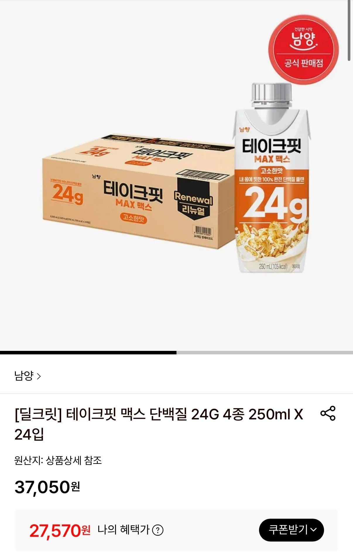 | 쿠팡 | 남양유업 테이크핏 맥스 호박고구마맛 250ml (24개) | 32,880원 | 호박고구마맛 단일 종류 기준 |