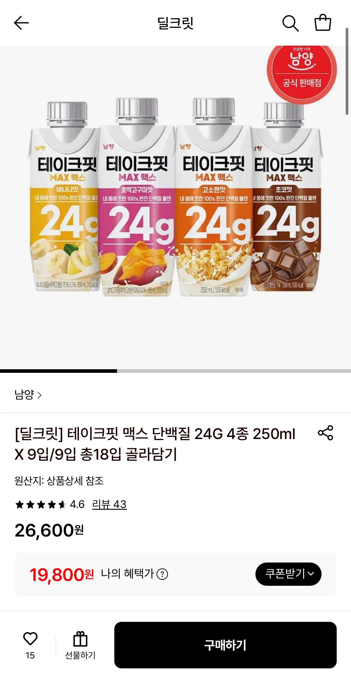 | 롯데온 | 테이크핏 맥스 250ml X 9입 골라담기 | 19,800원 | 핫딜모음에서 제공한 가격 |