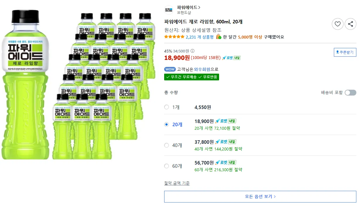 📦 파워에이드 제로 라임향, 600ml, 20개