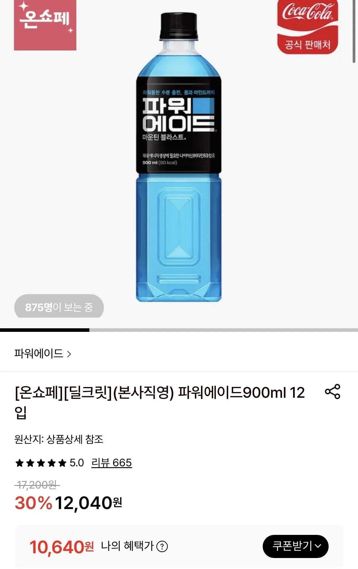 | 네이버페이 코카콜라직영몰 | 파워에이드 마운틴블라스트 PET 900ml 12개 | 13,760원 | 공식 직영몰 |