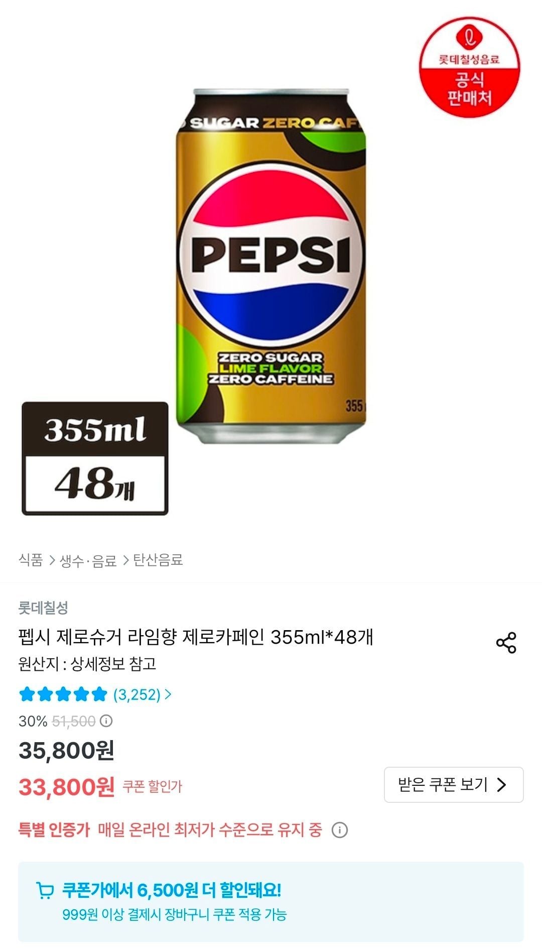 📦 펩시 제로슈거 라임향 제로카페인 355ml 48개
