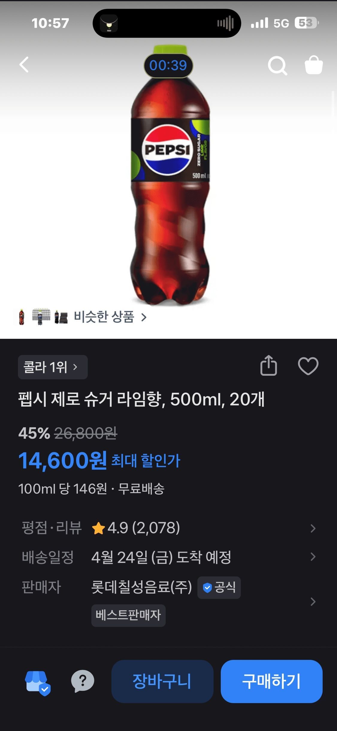 📦 펩시 제로 슈거 라임향, 500ml, 20개