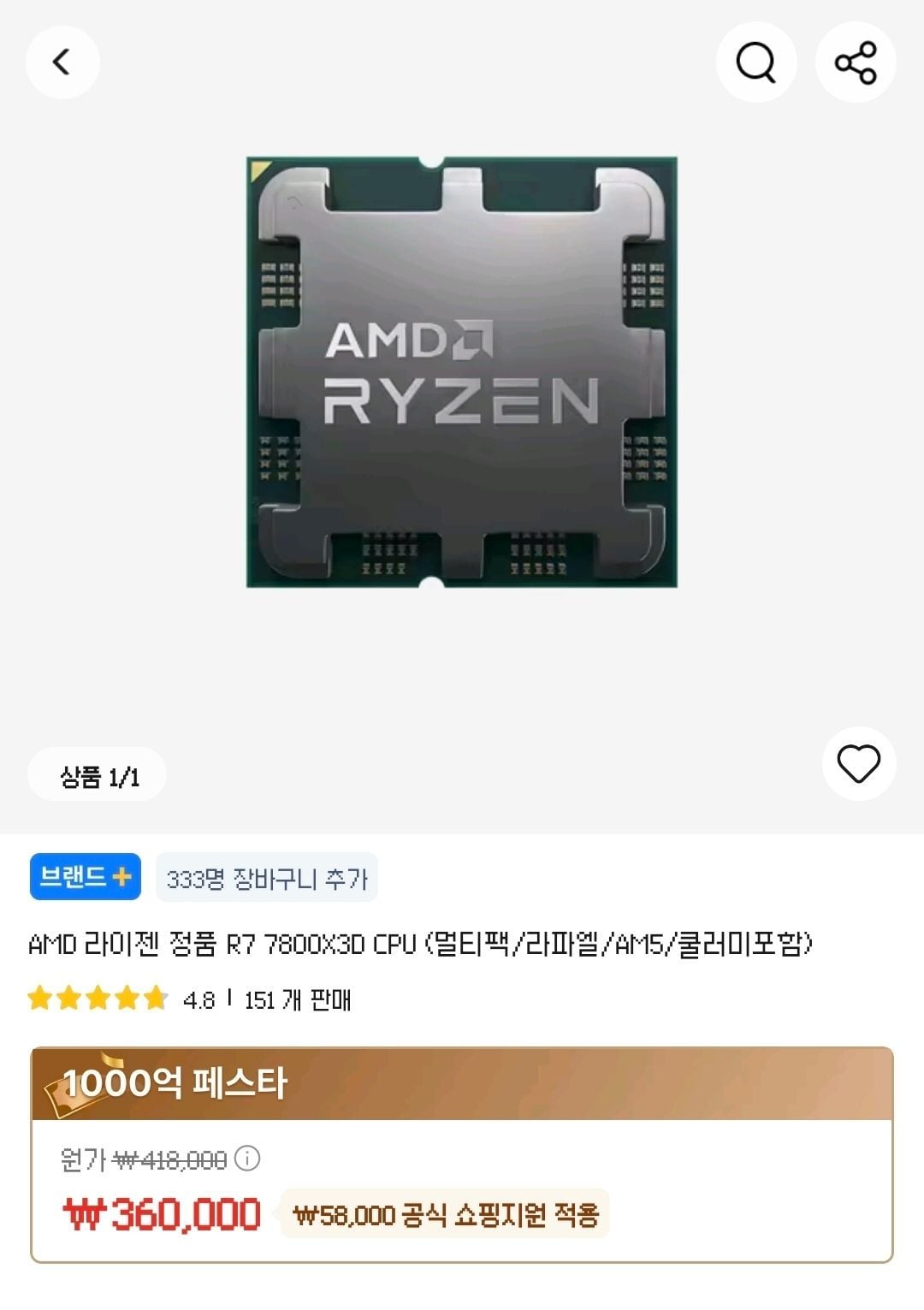 AliExpress[품절해제]AMD 라이젠 정품 R7 7800X3D CPU360,000원핫딜모음핫딜모음에서 제공한 가격