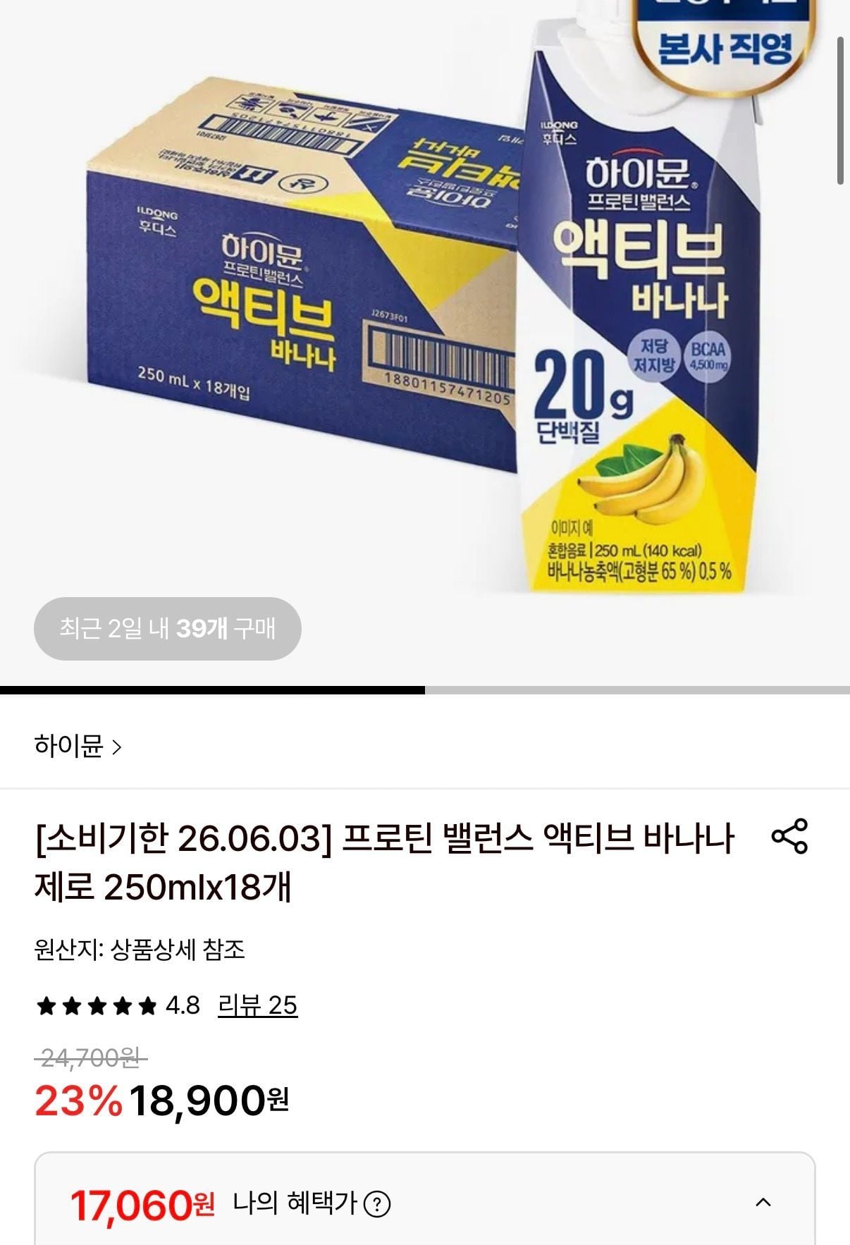 📦 프로틴 밸런스 액티브 바나나 제로 250ml 18개 (소비기한 6.3)