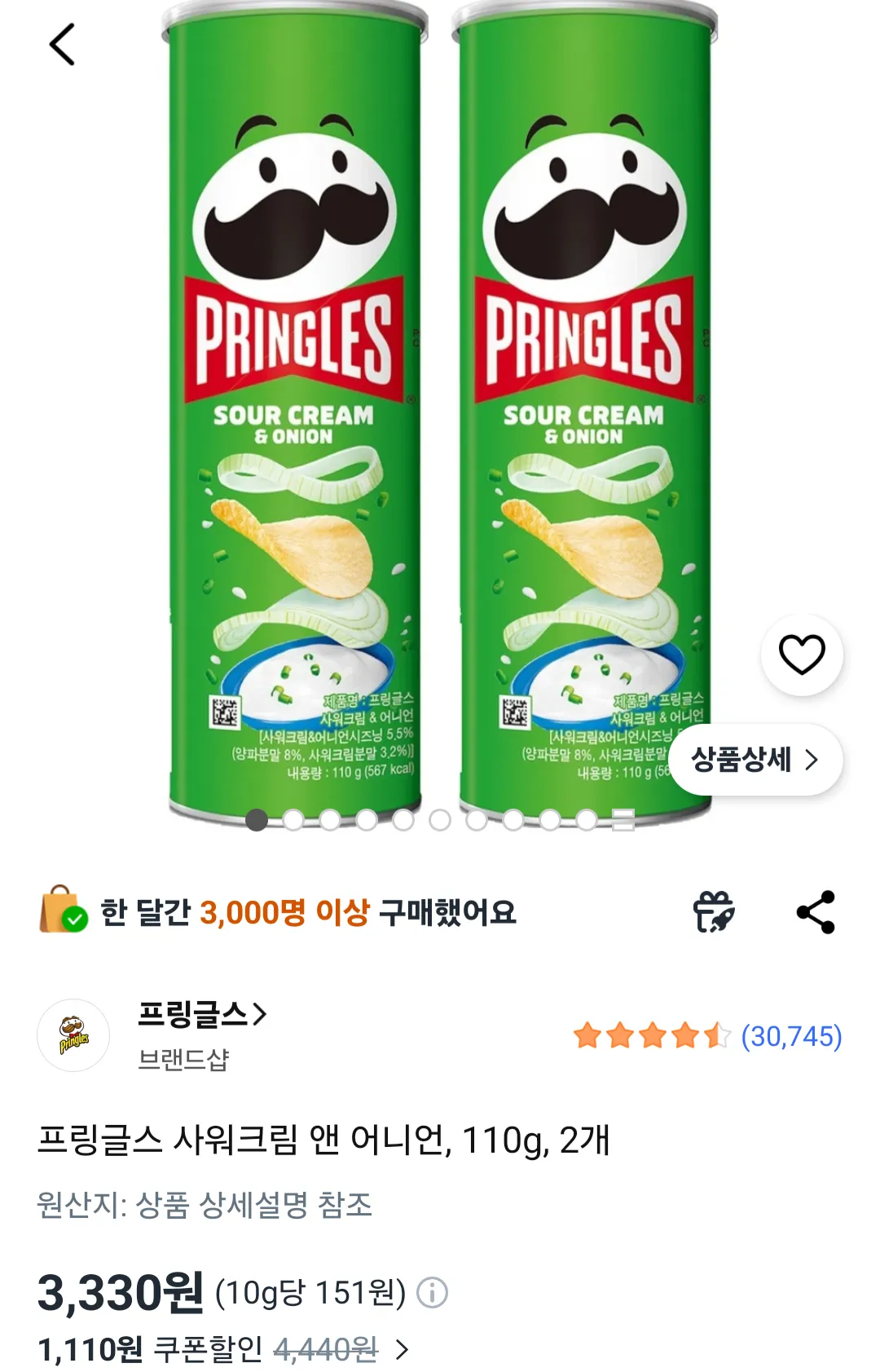 📦 프링글스 사워크림 앤 어니언, 110g, 2개