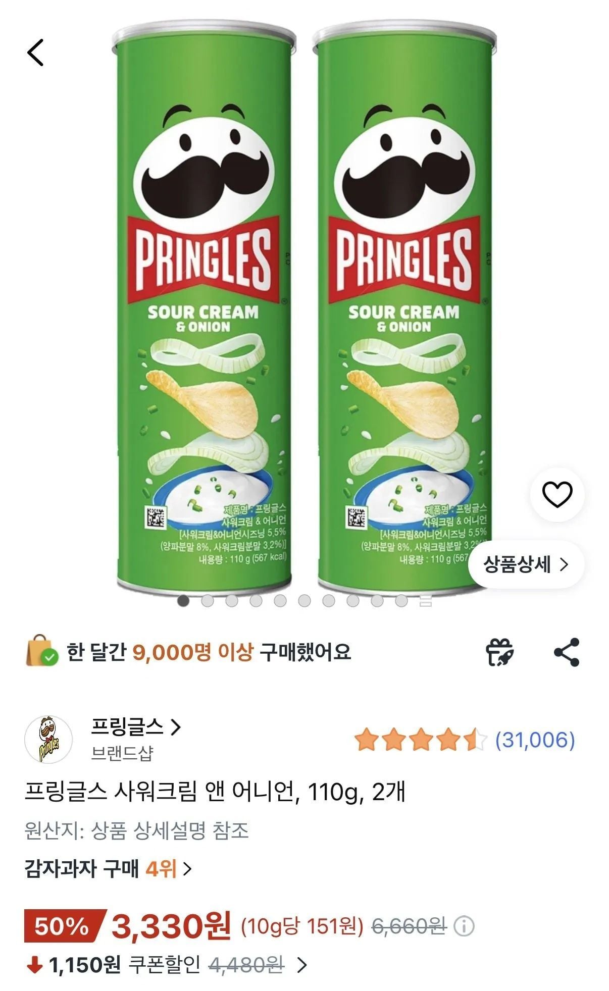 📦 프링글스 사워크림 앤 어니언, 110g, 2개