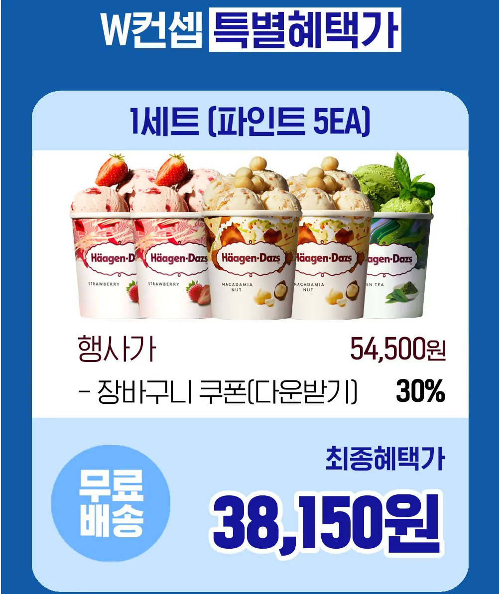 | W컨셉 | 하겐다즈 아이스크림 파인트 5개 골라담기 1+2+2 | 38,150원 | 핫딜모음에서 제공한 가격 |