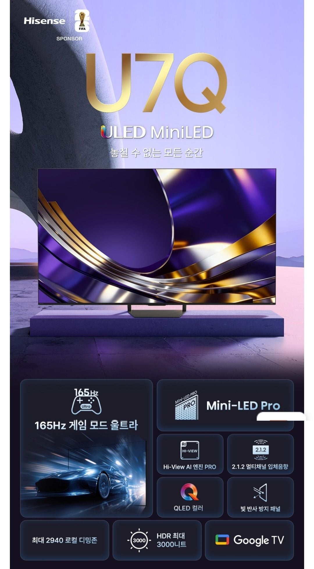 쿠팡Hisense 하이센스 4K ULED QD Mini LED 안드로이드 14 스마트TV, 189cm(75인치), 75U7Q1,819,090원쿠폰할인 9% 적용 가격
