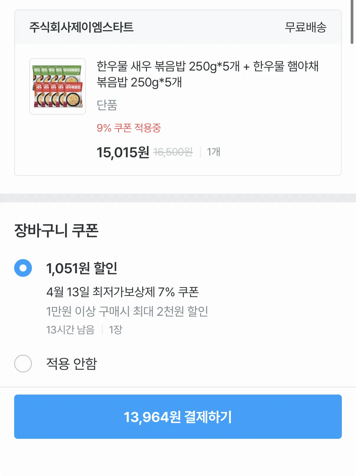 6종 맛 고를 수 있고 장바구니 쿠폰 받으면 13,964원임