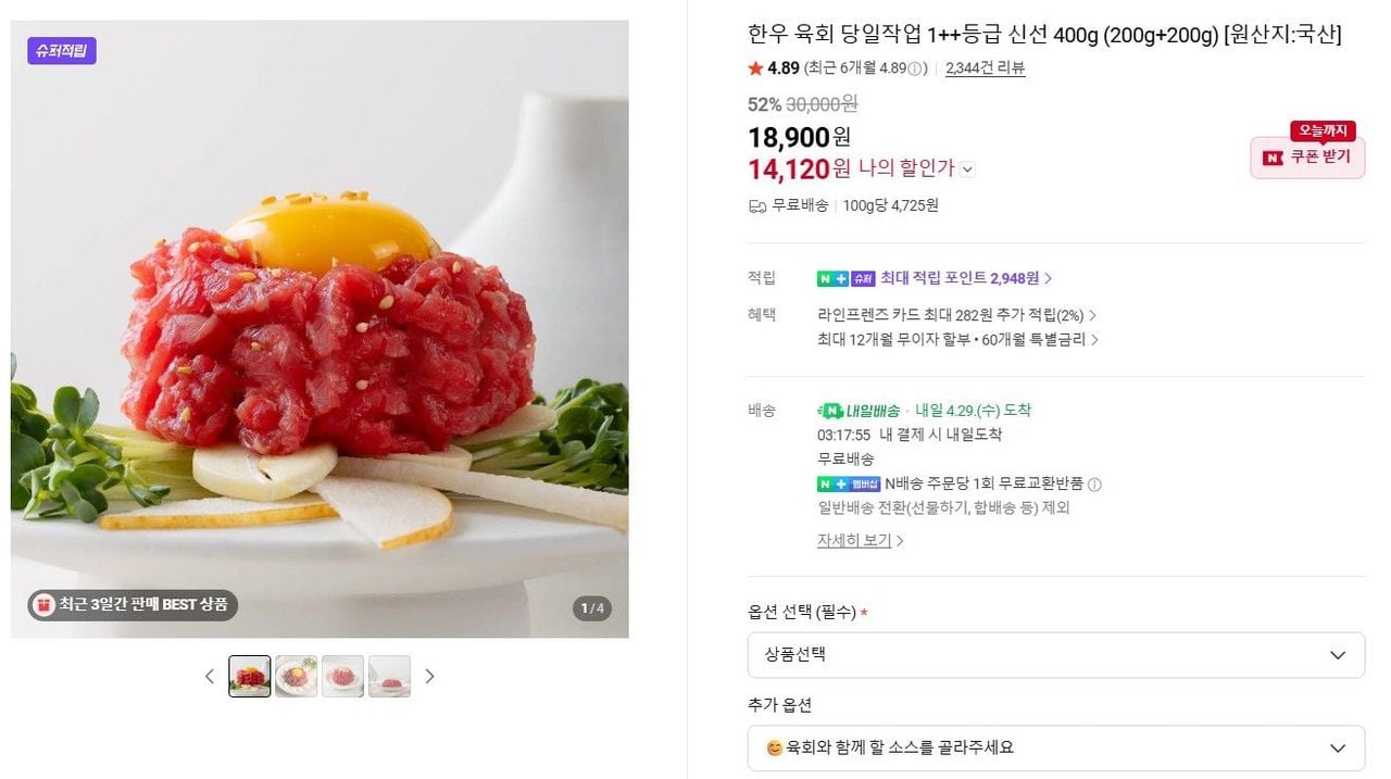 | 오아시스마켓 | 국내산 1등급 당일도축 한우 육회 400g | 13,900원 | 65% 할인된 가격 |