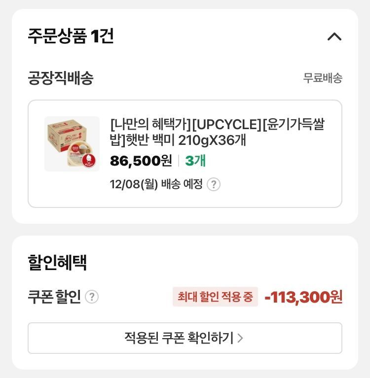 3. 햇반 36개 3박스 토스페이로 결제