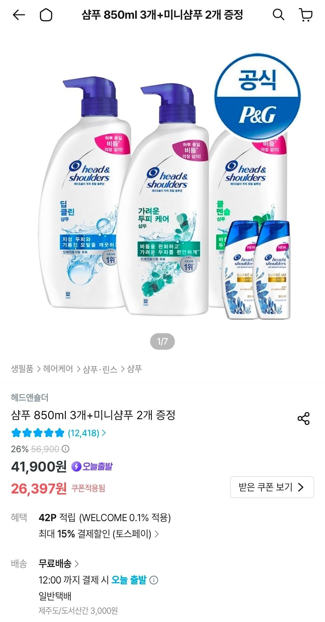 📦 헤드앤숄더 샴푸 850ml 3개+미니샴푸 2개