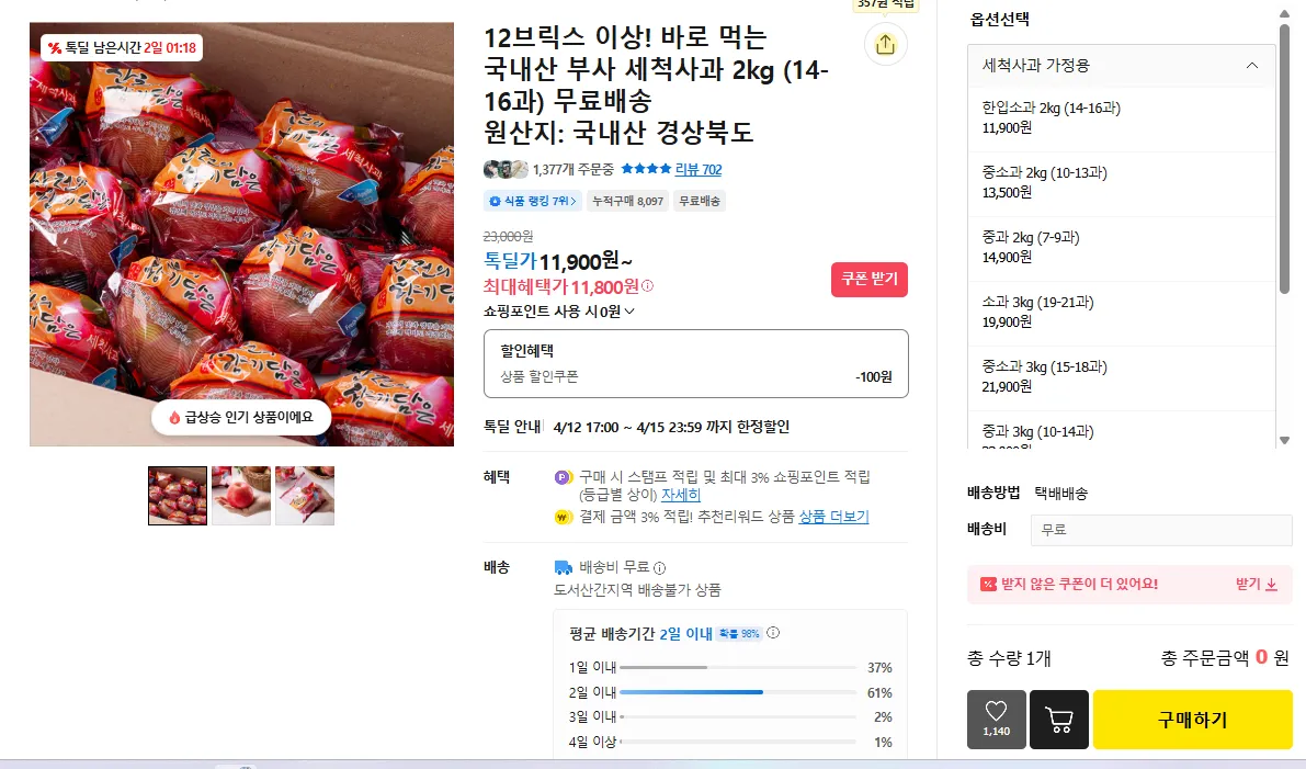 톡딜12브릭스 이상! 바로 먹는 국내산 부사 세척사과 2kg11,800원핫딜모음핫딜모음에서 제공한 가격