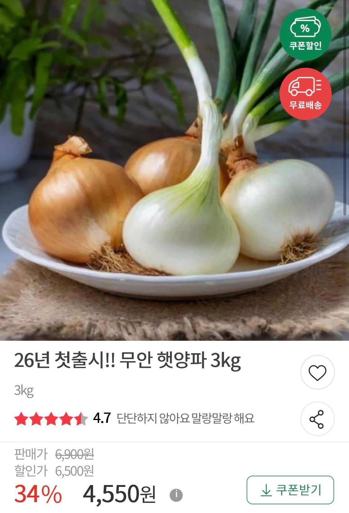 | 11번가 | 단단하고 신선한 햇 양파 3kg 국내산 무안 | 7,570원 | EMBLEM 브랜드 |