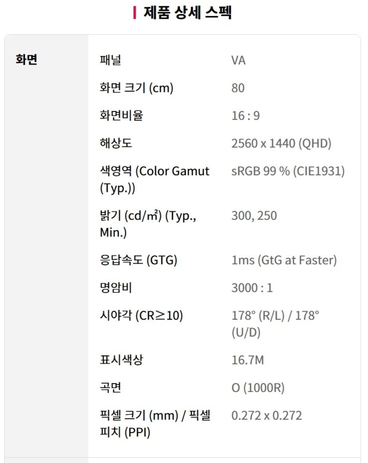 32인치 / 커브드 / QHD / VA / 180Hz주사율 / 틸트,스위블