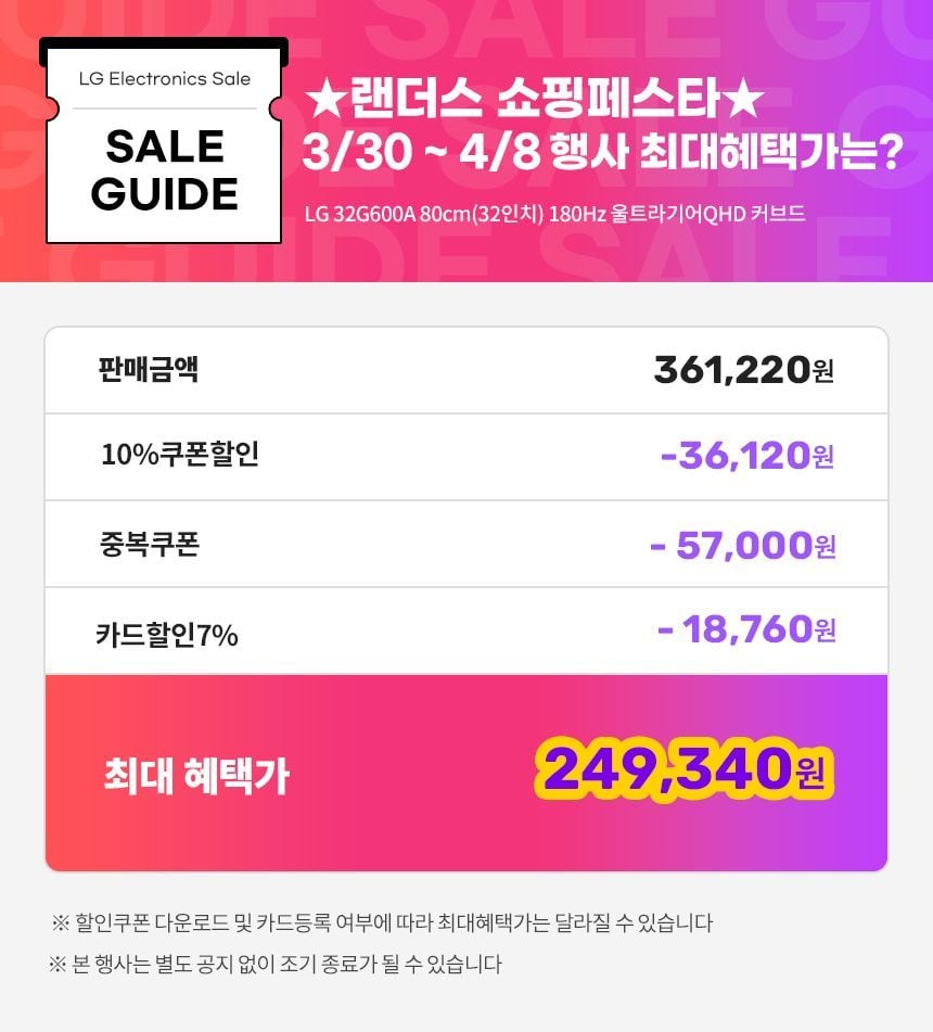 | 11번가 | LG 게이밍모니터 울트라기어 180Hz QHD 32G600A | 239,000원 | 최종 체감가, 수량 한정 |
