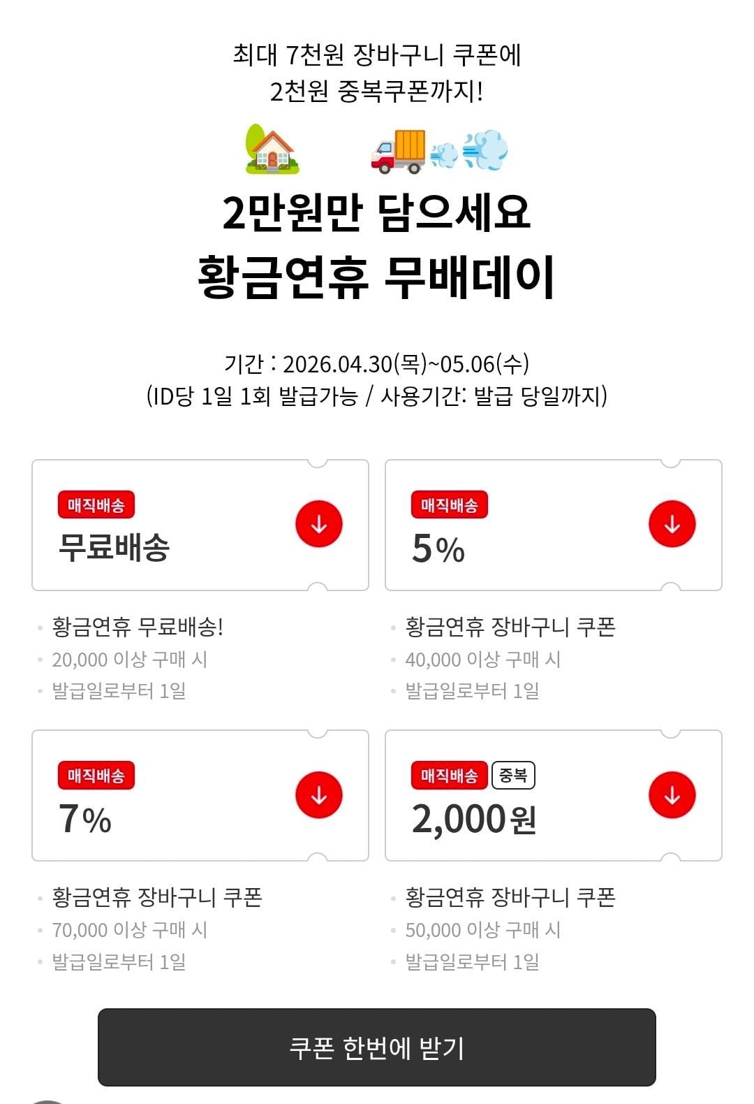 📦 4.30~5.6) 황금연휴 무배데이 2만이상 무료배송 + 장바구니 쿠폰