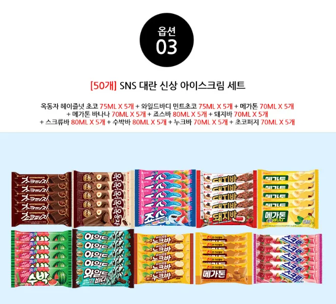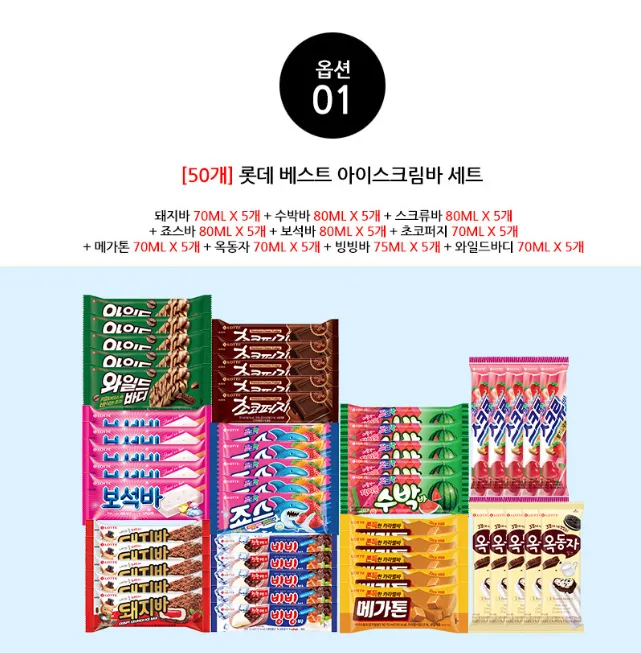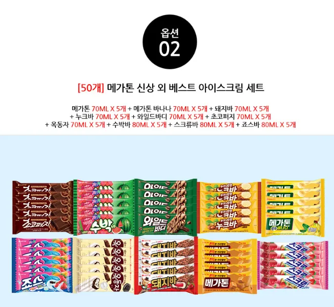 | 오늘의집 | [50개] 아이스크림 바류 10종x5개(아맛나/돼지바/메가톤/와일드바디/빙빙바 등) | 19,845원 | 핫딜모음에서 제공한 가격 |
