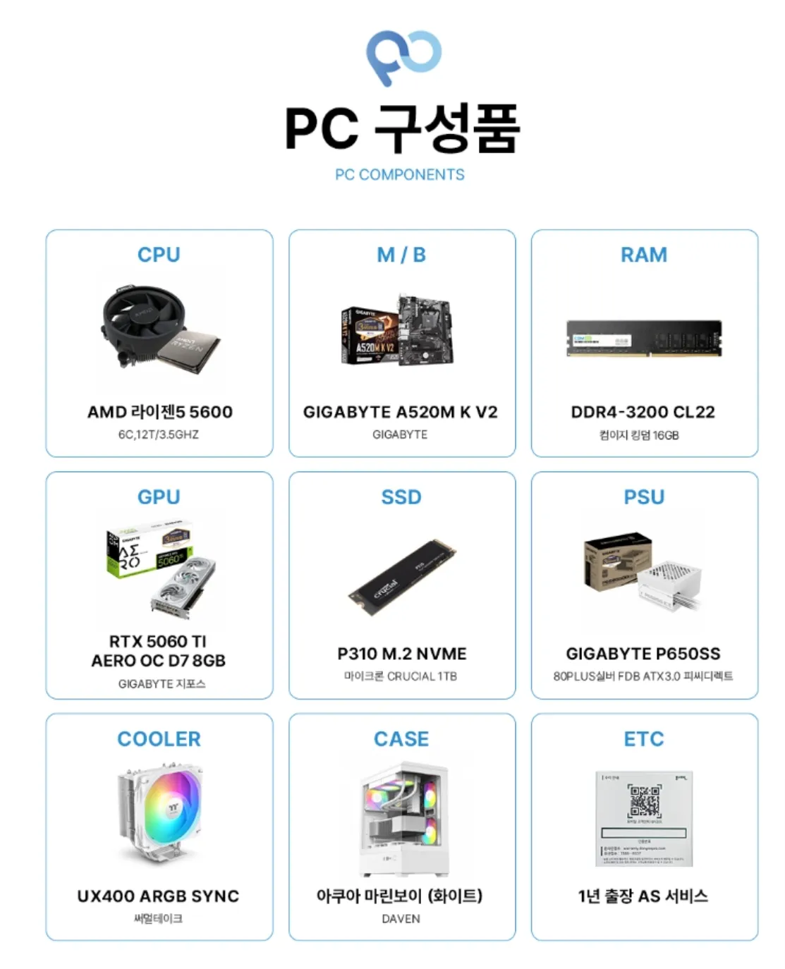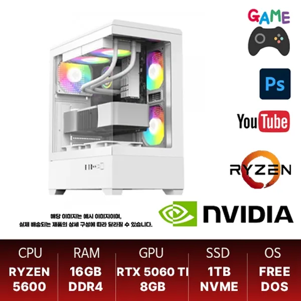 라이젠 5600 조합인데 5060ti 3팬짜리 달려있고 화이트 컨셉으로 잡은거같음 (조합이 좀 이상한데 ㅋㅋㅋ)