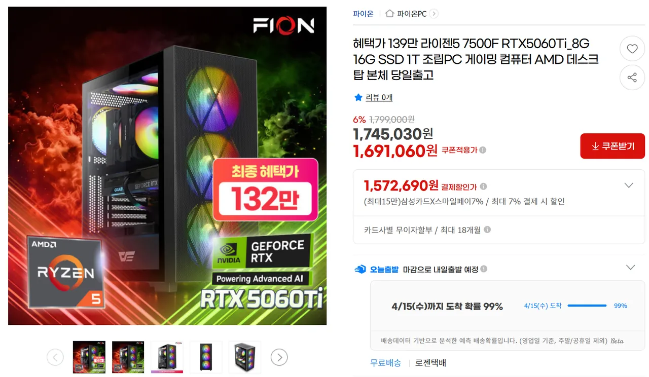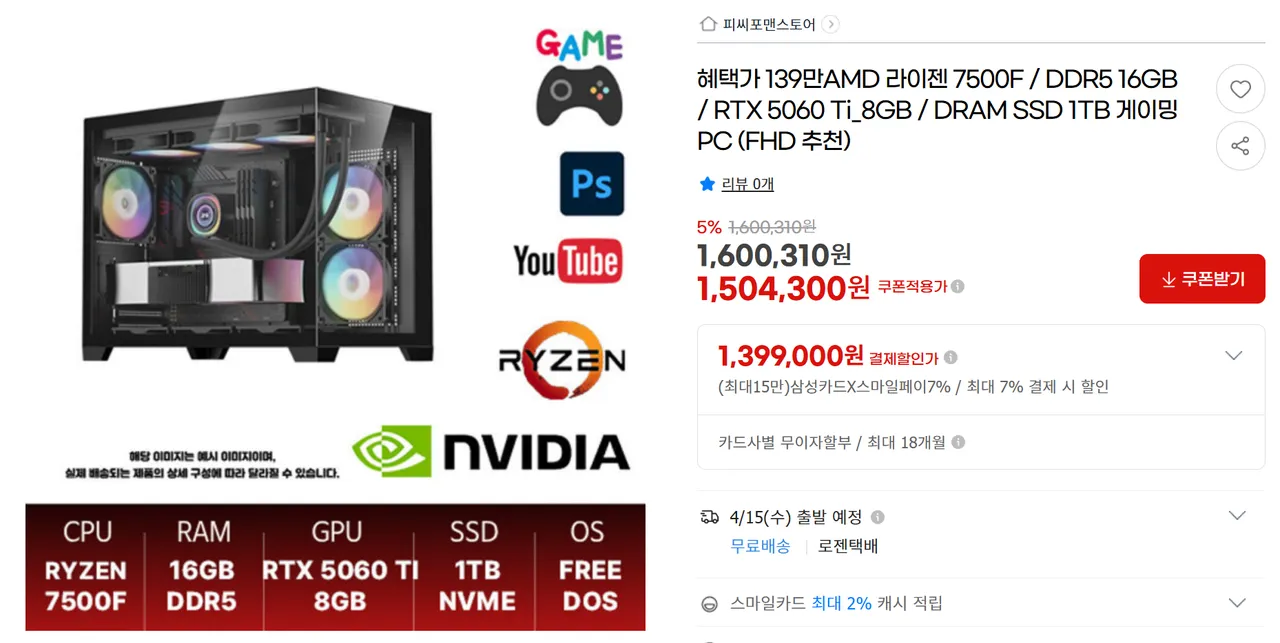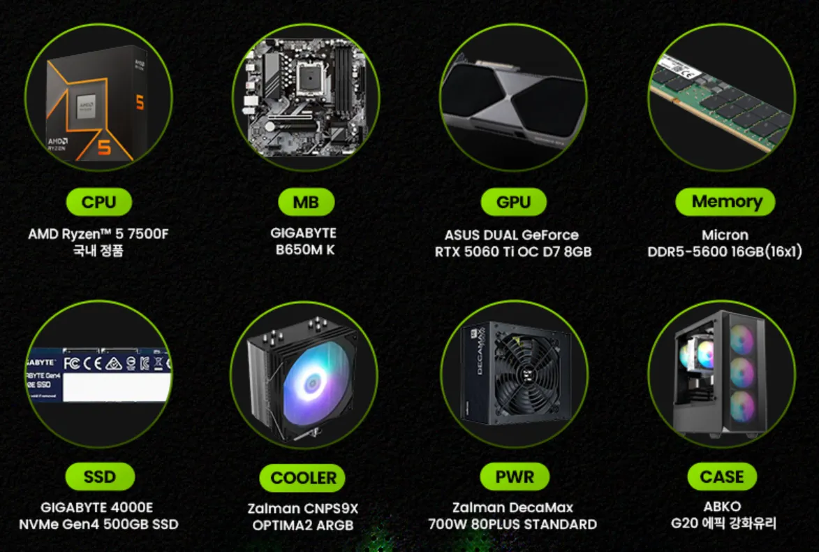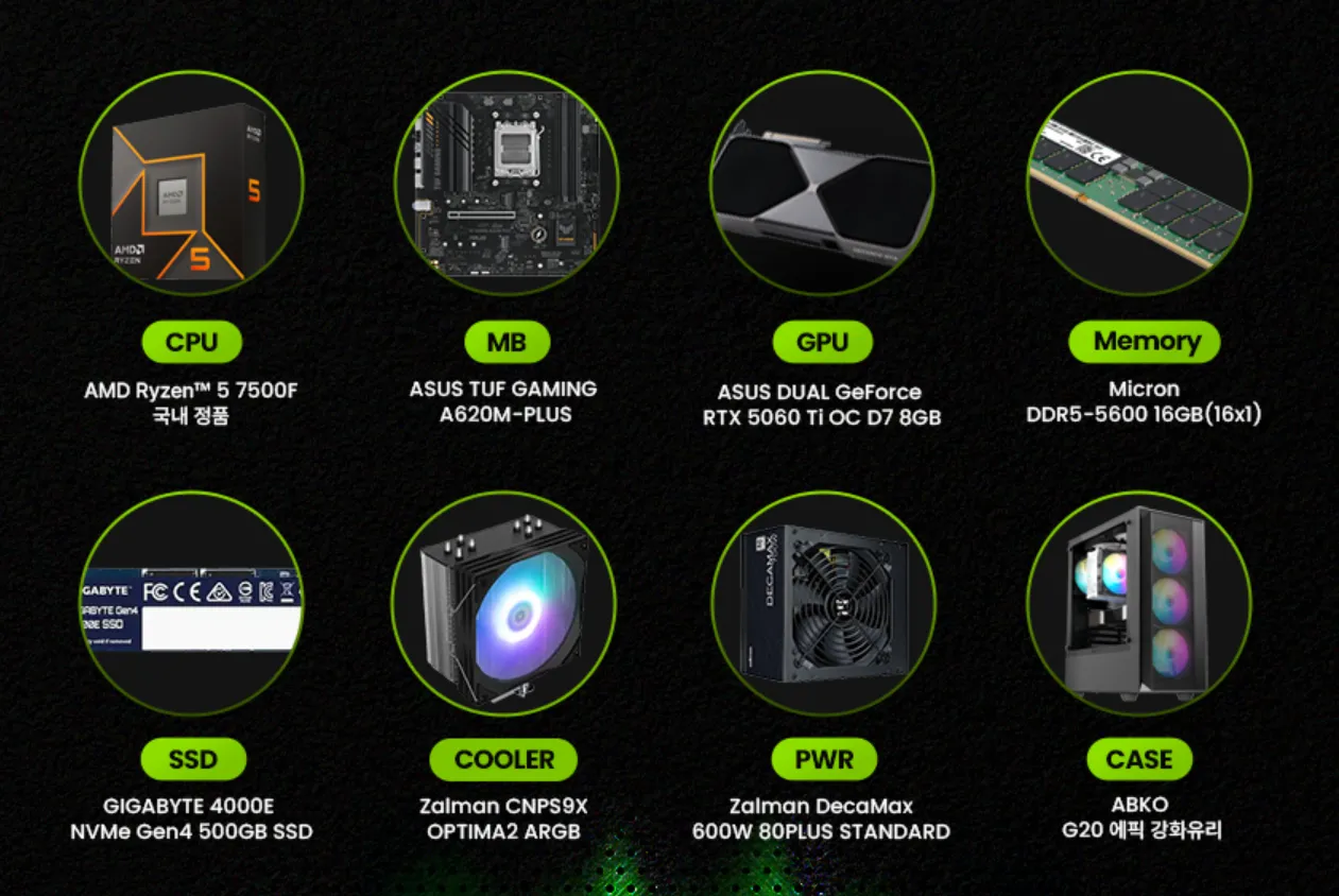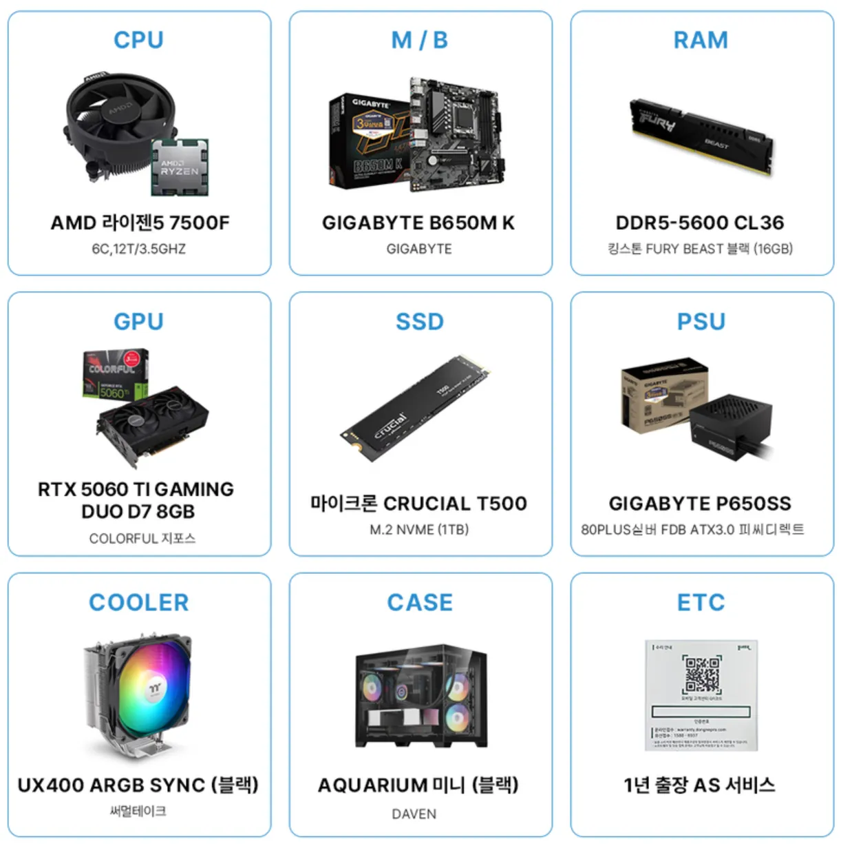 | 이마트 | 라이젠5 7500F RTX5060TI 8GB 조립PC 게이밍 데스크탑 | 1,649,000원 | 16GB RAM / 500GB SSD 사양 |