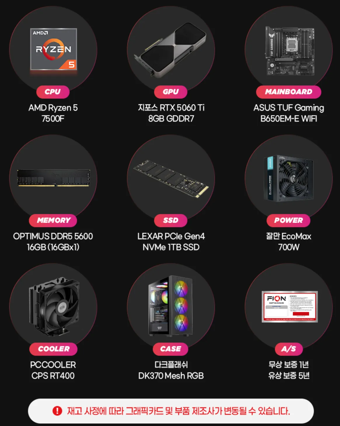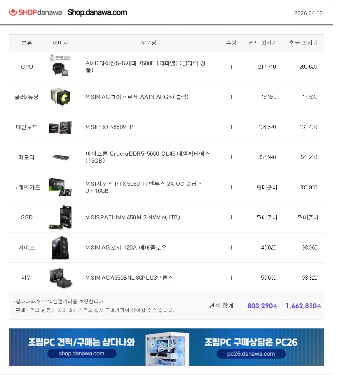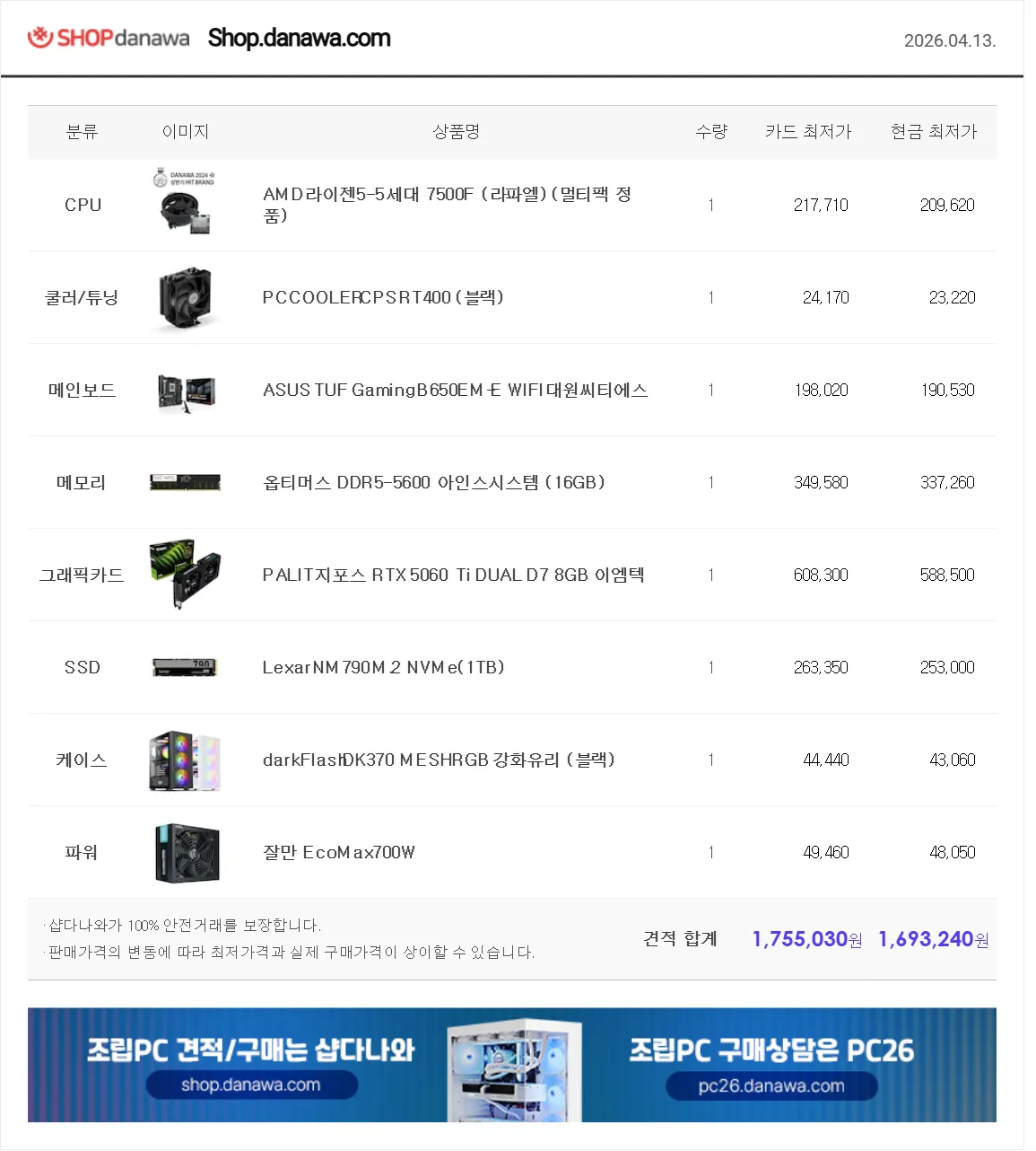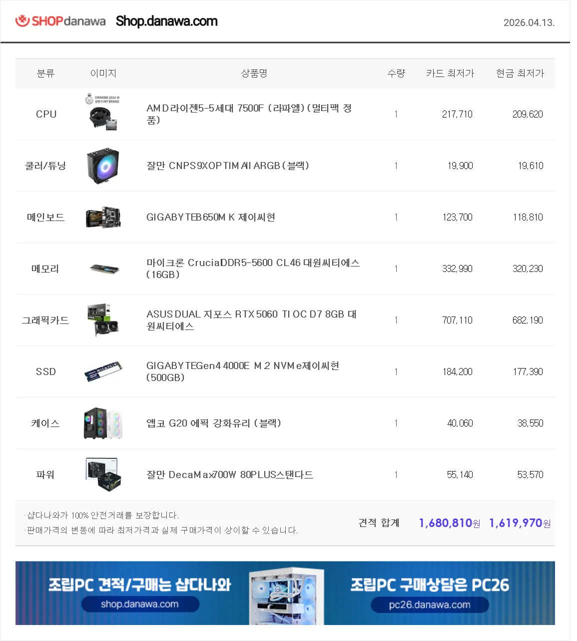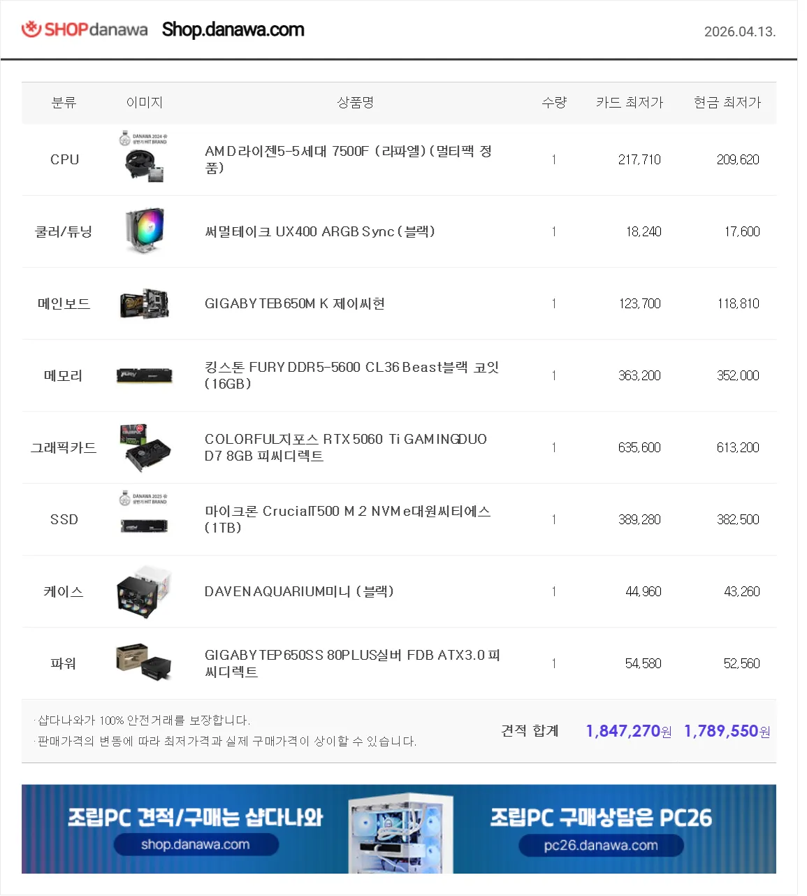 | 포유컴퓨터 (다나와) | 퍼포먼스PC 47 R5 7500F RTX5060Ti | 미공개 | 다나와 인기 순위 1위, 최저가 확인 필요 |