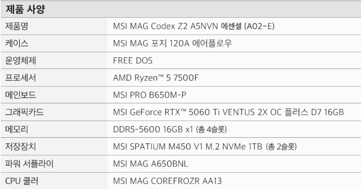| 11번가 | MSI MAG 코덱스 Z2 A5NVN 에센셜 (A02-E) AMD R5-7500F/RTX 5060Ti 게이밍컴퓨터 | 1,925,000원 | 16G RAM / 1TB SSD / 최대혜택 적용 판매가 |