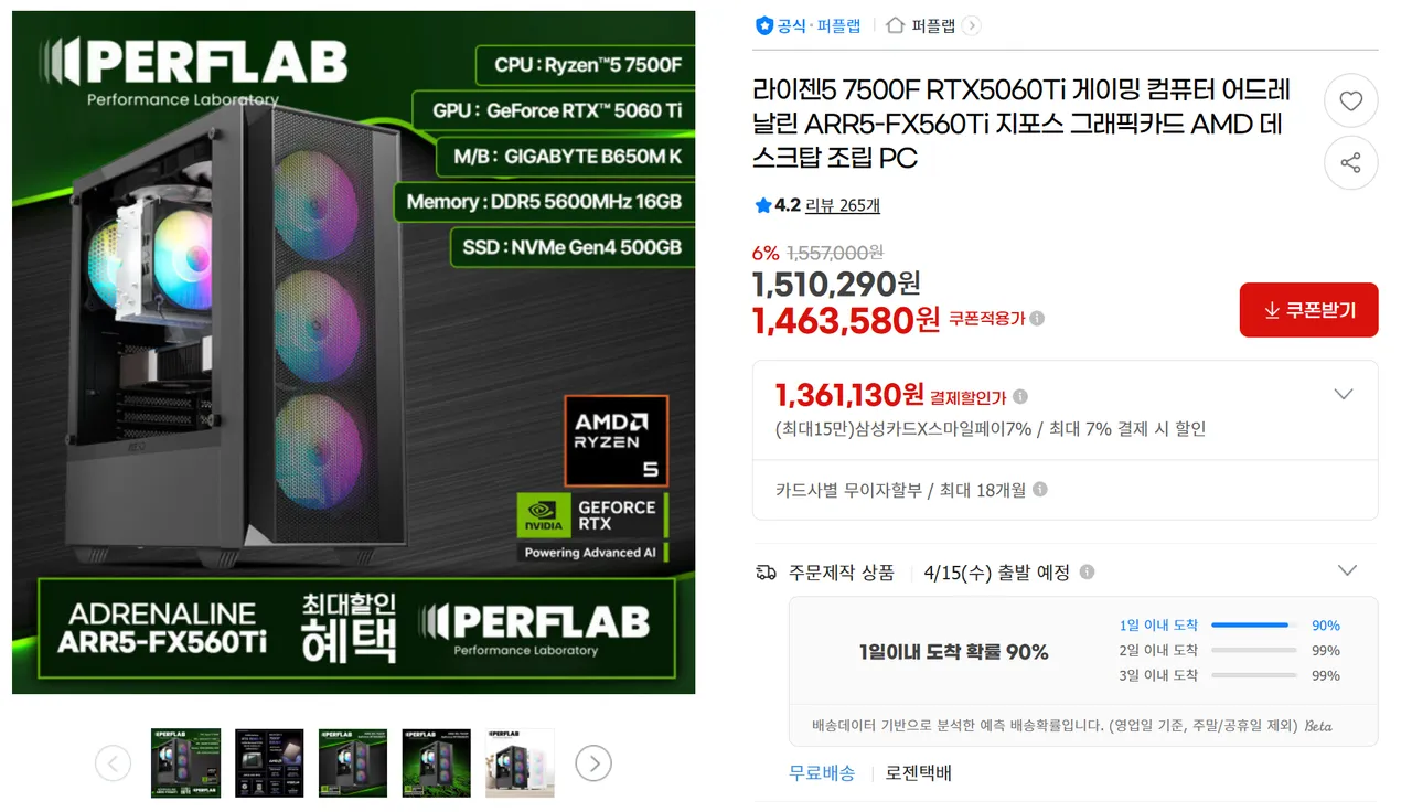 | G마켓 | 7500F / 5060 ti 완본체 모음 | 1,361,130원 | 핫딜모음에서 제공한 가격 |