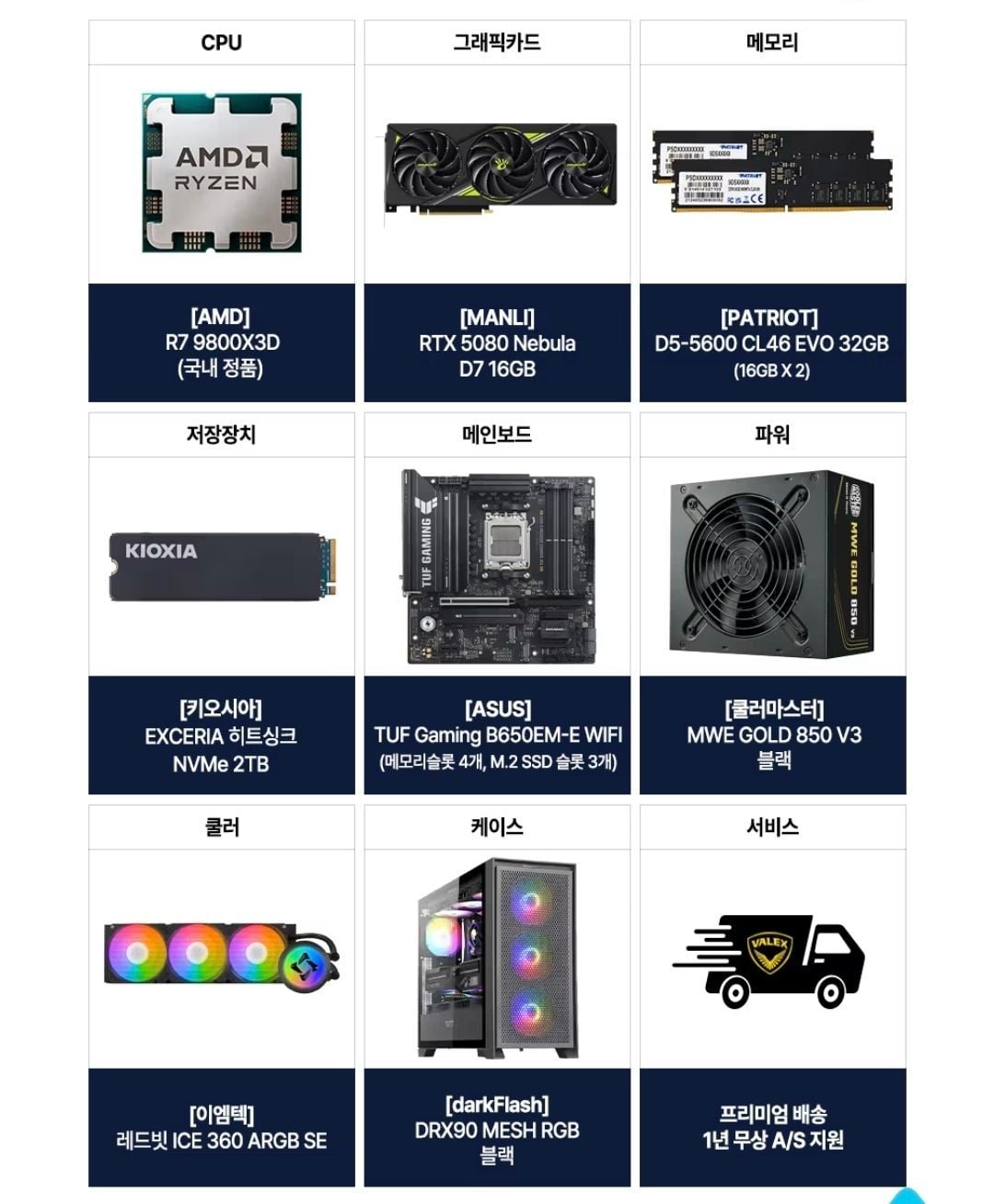 | e-하이마트 | AMD 9800X3D+RTX5080+32GB+2TB/B850M | 3,839,900원 | B850M 마더보드 사양 |