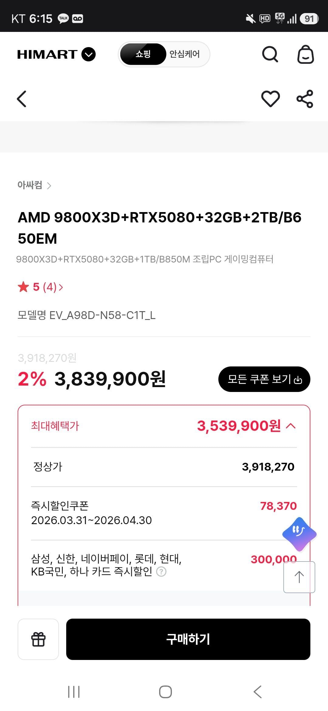 | 롯데하이마트 | AMD 9800X3D+RTX5080+32GB+2TB/B650EM | 3,887,000원 | 일반가 |