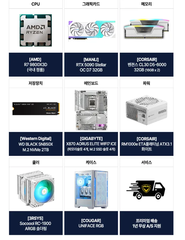 | 샵다나와 | AMD R7-9800X3D/RTX 5090/32G 조립PC | 8,500,000원 | 스펙 상세 확인 필요 |